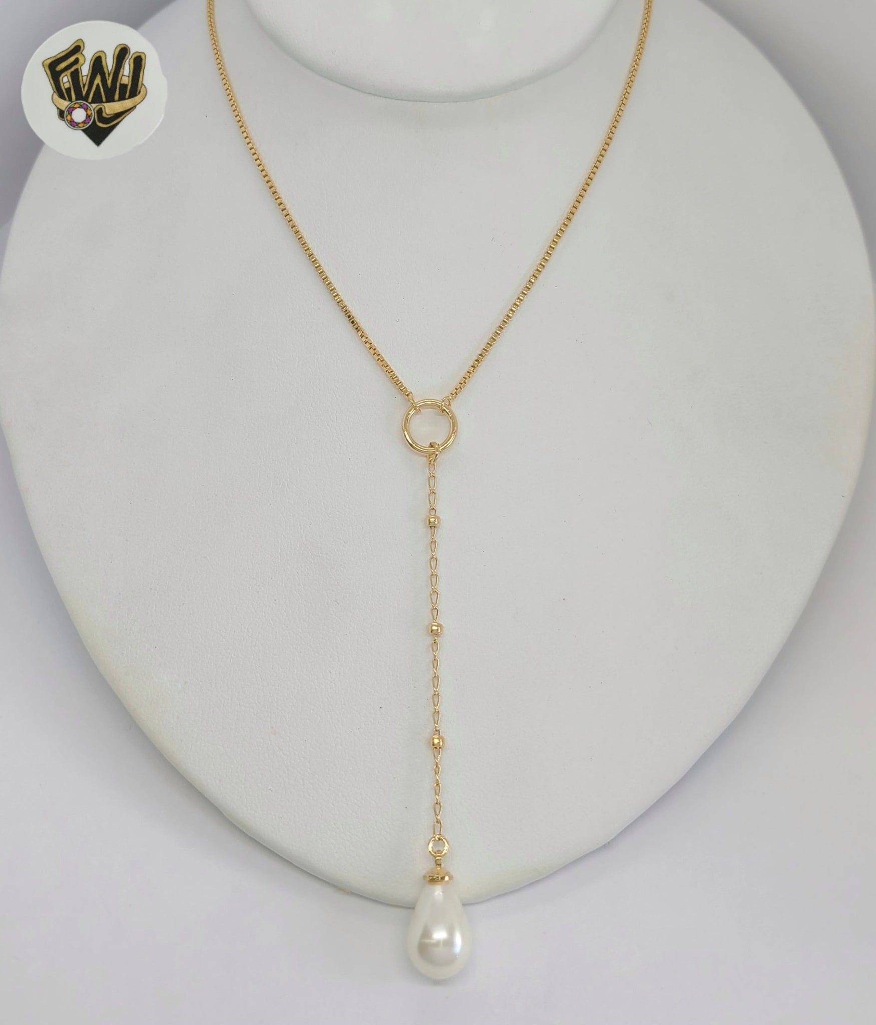 (1-6395-2) Gold Laminate - Box Link Lariat Pearl Necklace - 16" - BGF